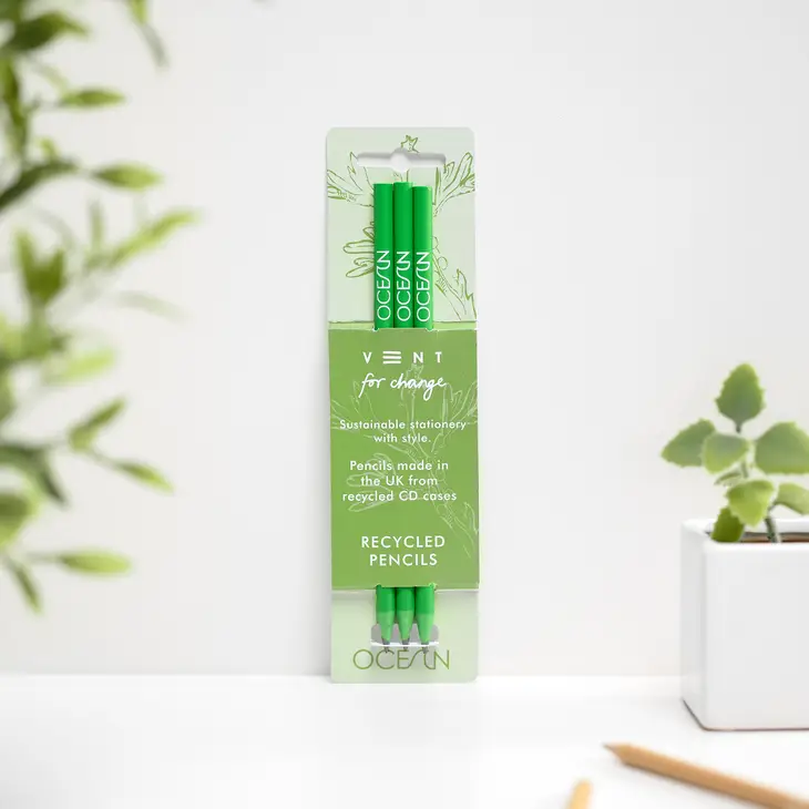 A pack of 3 recycled ocean Algae Green pencils in Vent For Change’s pencil sleeve.