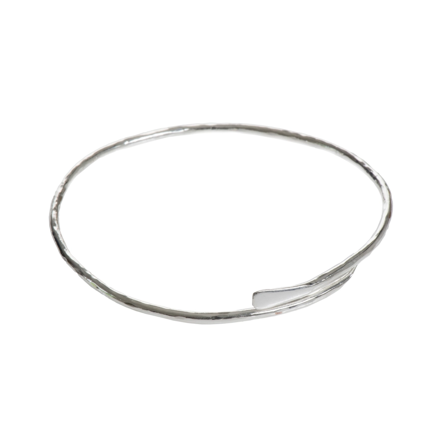 This silver plated bangle from Just Trade has been handmade from brass wire and planished using a specialist hammer to give it texture. It has been plated with silver in the UK.