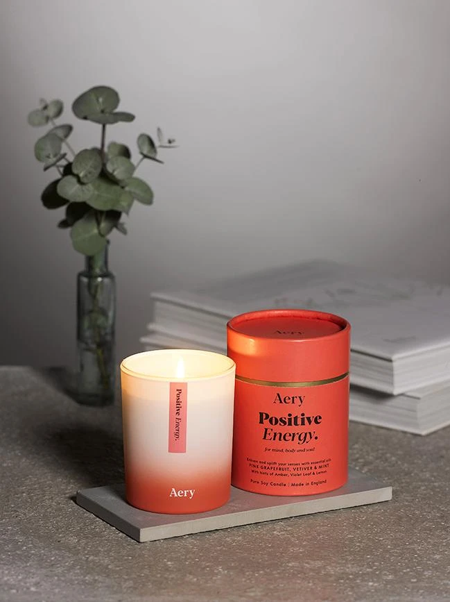 This Positive Energy Aromatherapy Candle for Aery Living will enliven and uplift your senses. With its blend of Pink Grapefruit, Vetiver and Mint as well as hints of Amber, Violet Leaf & Lemon it will soothe your mind, body and soul.