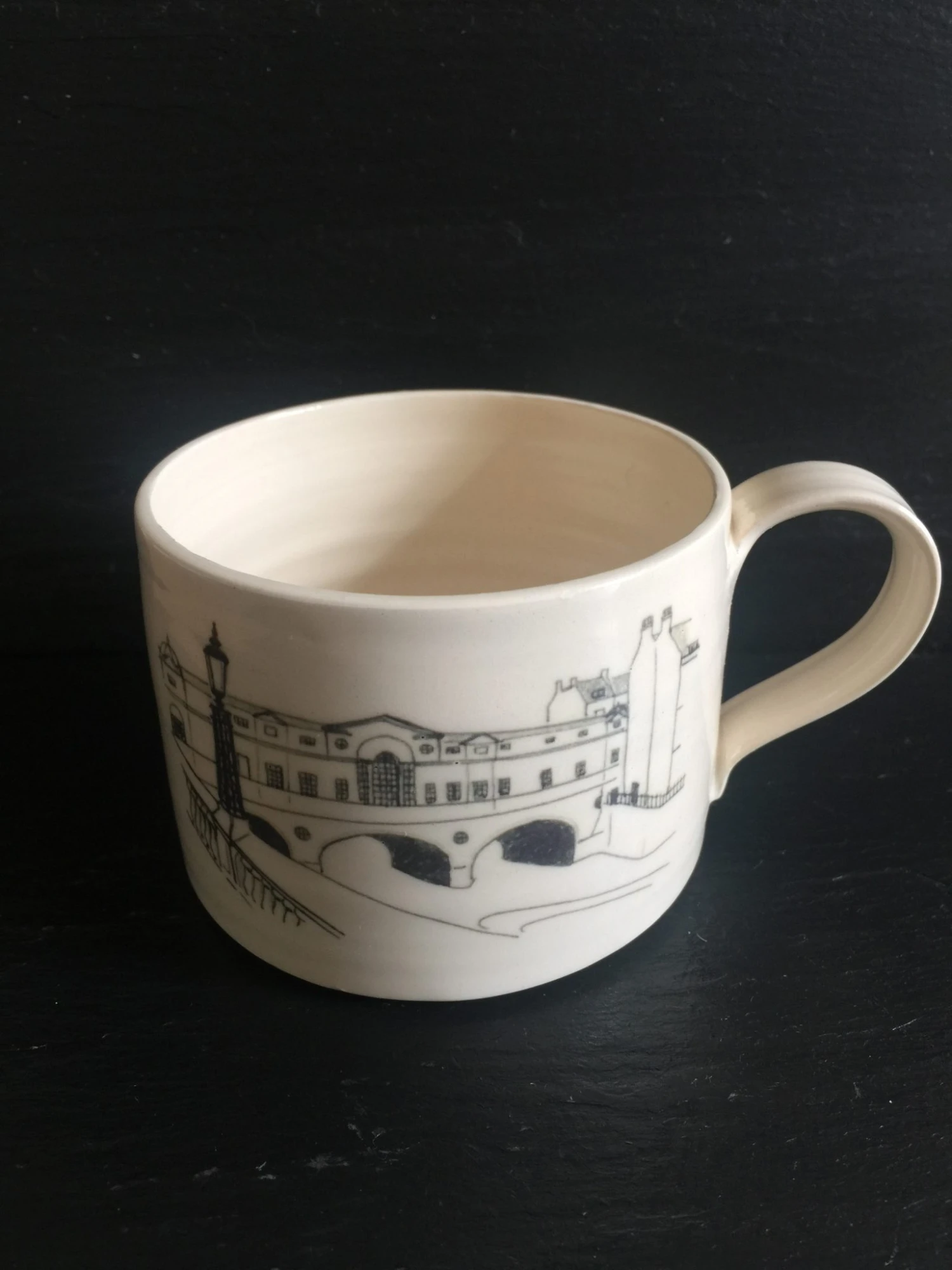 This handmade Pulteney Bridge Ceramic Mug from local artist Wendy Calder depicts her pencil drawing of the iconic Bath bridge. Each mug is handshaped on her potters wheel. As a result they do all vary slightly in shape and size, making each one unique.