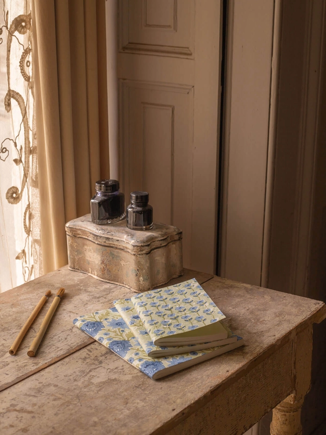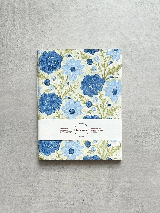 These beautiful Floribunda A5 Notebooks are made from 100% cotton paper. These notebooks from Bohemia Design have been decorated with traditional hand block printed covers in a pretty sage and blue floral design.