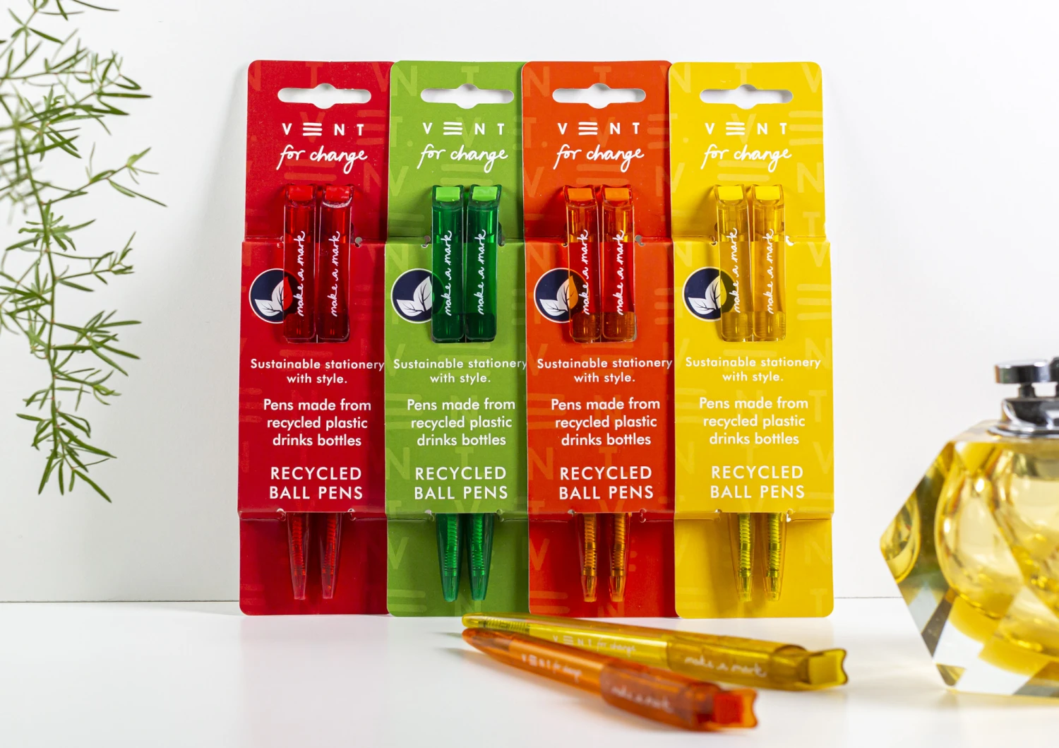 Pack of 2 recycled pens in Vent For Change’s Yellow Make a Mark pen sleeve. The pens are printed with a Make a Mark design.
