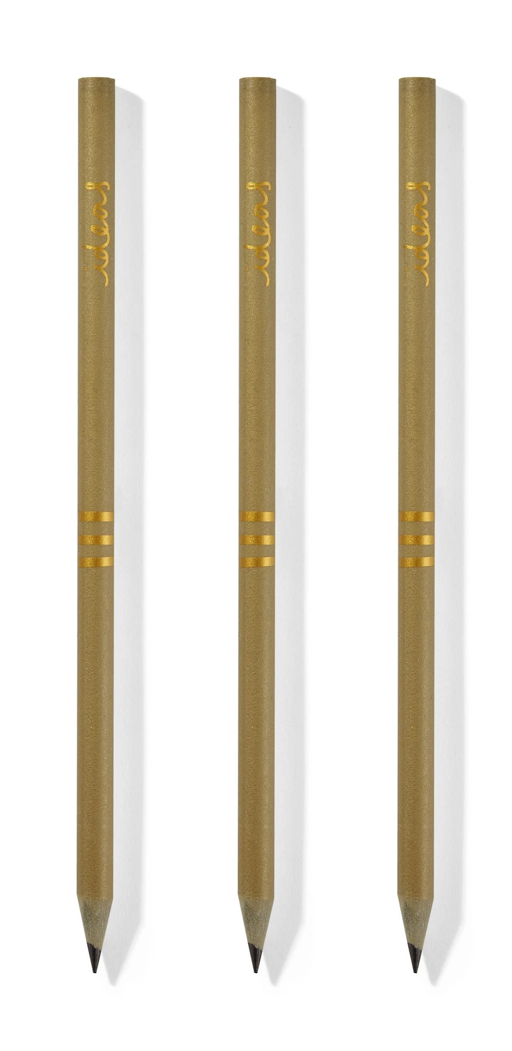 Pack of 3 recycled gold pencils in Vent For Change’s green Ideas pencil sleeve. The pencils are finished with a stunning gold embossed ‘ideas’ logo. They have a hard graphite grey writing core.