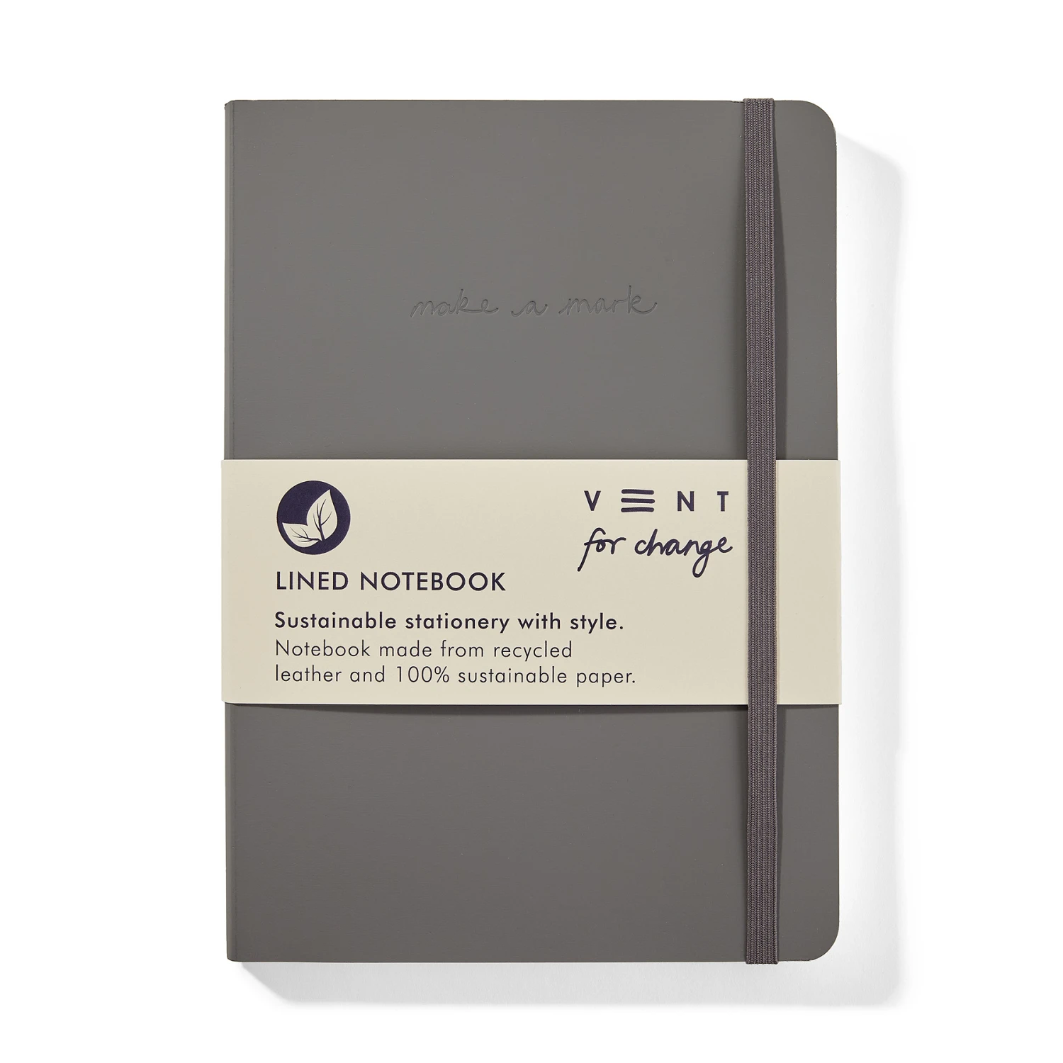 A stunning slim medium (A5) grey leather notebook made with recycled leather covers and 100% sustainable paper. Subtly debossed on the front cover with Vent For Change’s Make a Mark logo. Supplied as standard with 62 pages of 80gsm white mixed lined and plain paper (half lined, half plain). Thread stitched to the spine for added durability.