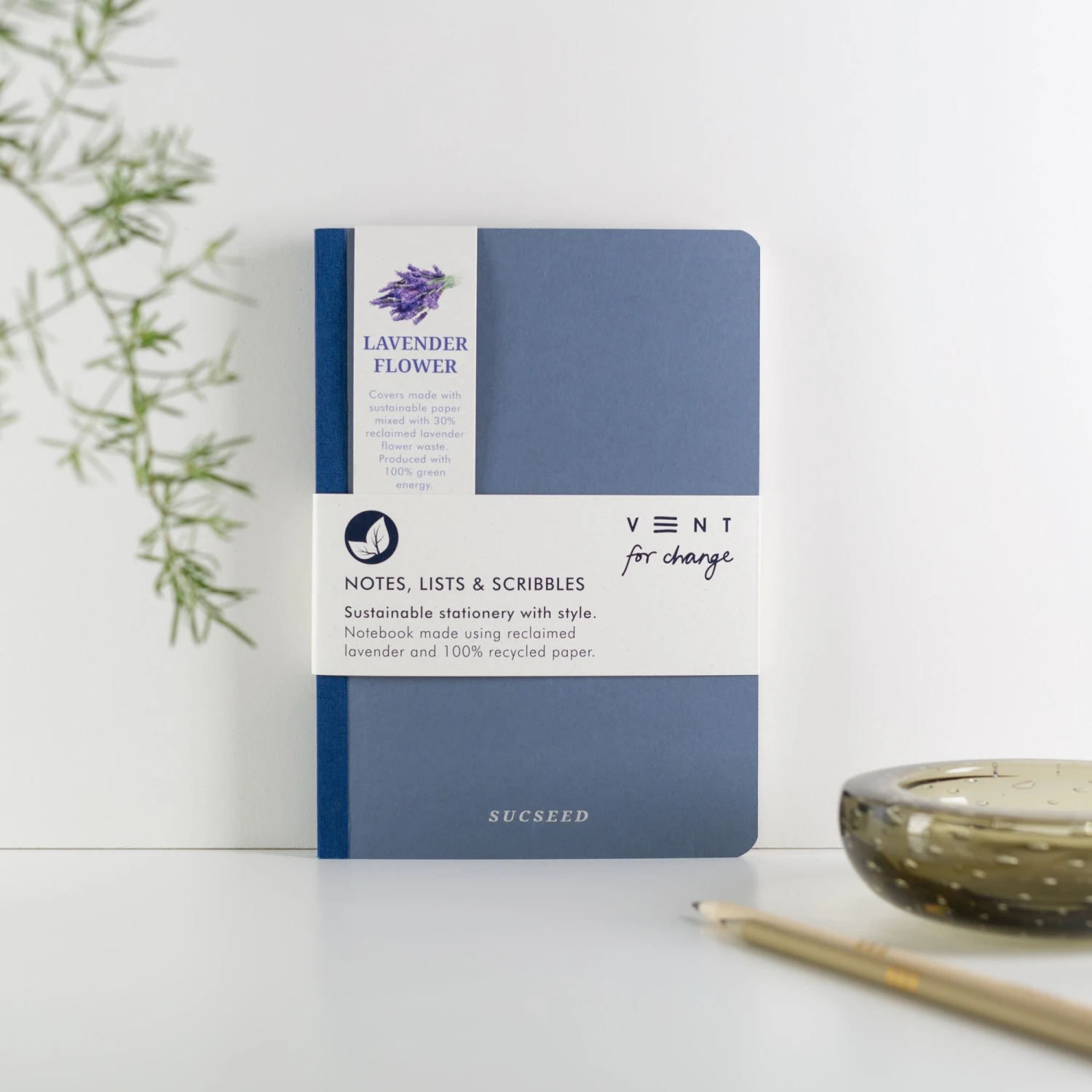 Stunning and stylish Sucseed A5 notebook. The covers have been made using reclaimed lavender flower mixed with recycled paper. Foil embossed to the front cover in silver with Vent For Change’s SUCSEED design. The back cover has a lavender flower design in silver. Each book comes with lined, plain and numbered notes throughout. Page marker supplied as standard. A beautiful gift or a treat for yourself – who doesn’t love new stationery?!