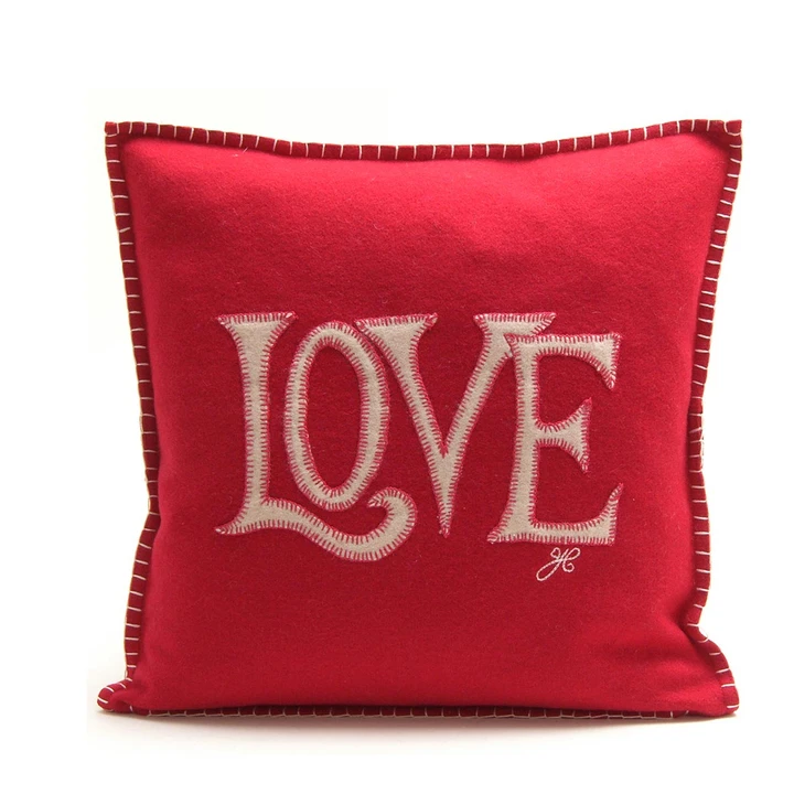 This designer hand embroidered Jan Constantine Love Cushion in pure red wool, has the word ‘LOVE’ hand-embroidered in cream across the front in Jan Constantine’s own distinctive and unique appliquéd script. This famous luxury wool Love cushion is a variation of Jan’s original red gingham Love cushion and it became part of the Pop Art Collection of 2006. It is appliquéd with cream letters, which are hand embroidered with red blanket stitch around the edges. The cushion is also blanket stitched around the edges in cream. This Love cushion is a big favourite of all time and is instantly recognized as an iconic Jan Constantine classic design.
