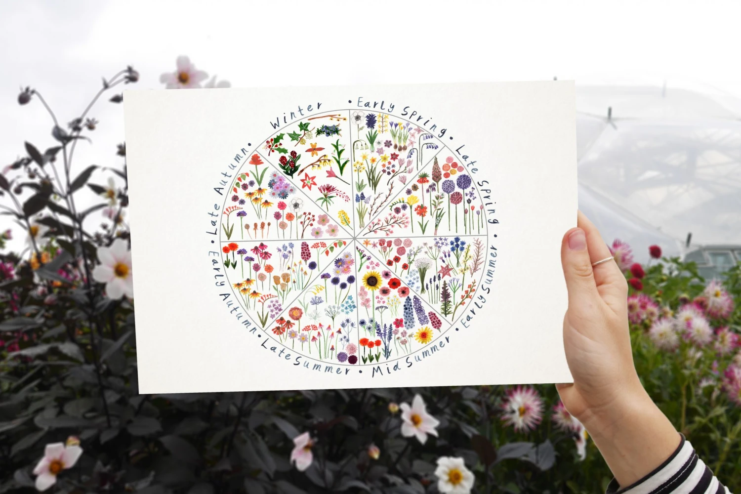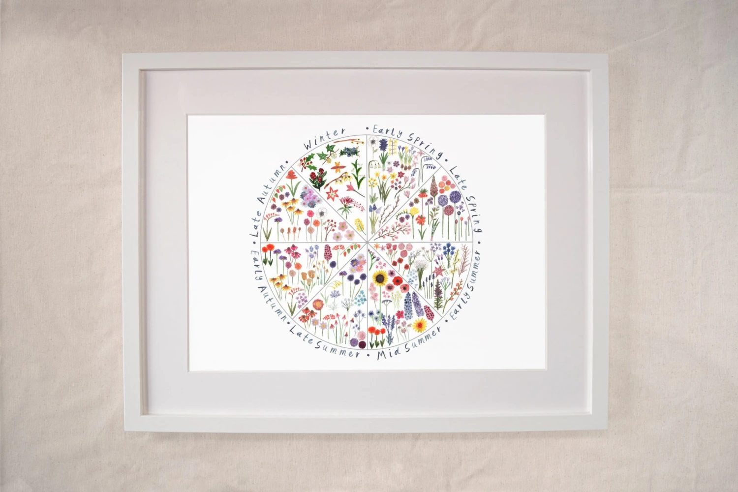 This is a wonderful limited edition Seasonal Flowers A3 Art Print is a giclee print by Hattie Buckwell. Hattie is an artist working in Bristol, England. She primarily works in watercolour. This print takes you through the seasons and shows you which flowers to look for.