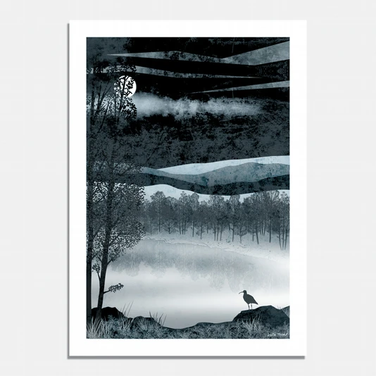 This misty moonlit Silver Loch is one of two nighttime images that form part of Ruth Thorp’s Golden Forest Collection – a series inspired by the incredible Cairngorms landscape. It also has a sister daytime of the same scene called Take Flight.