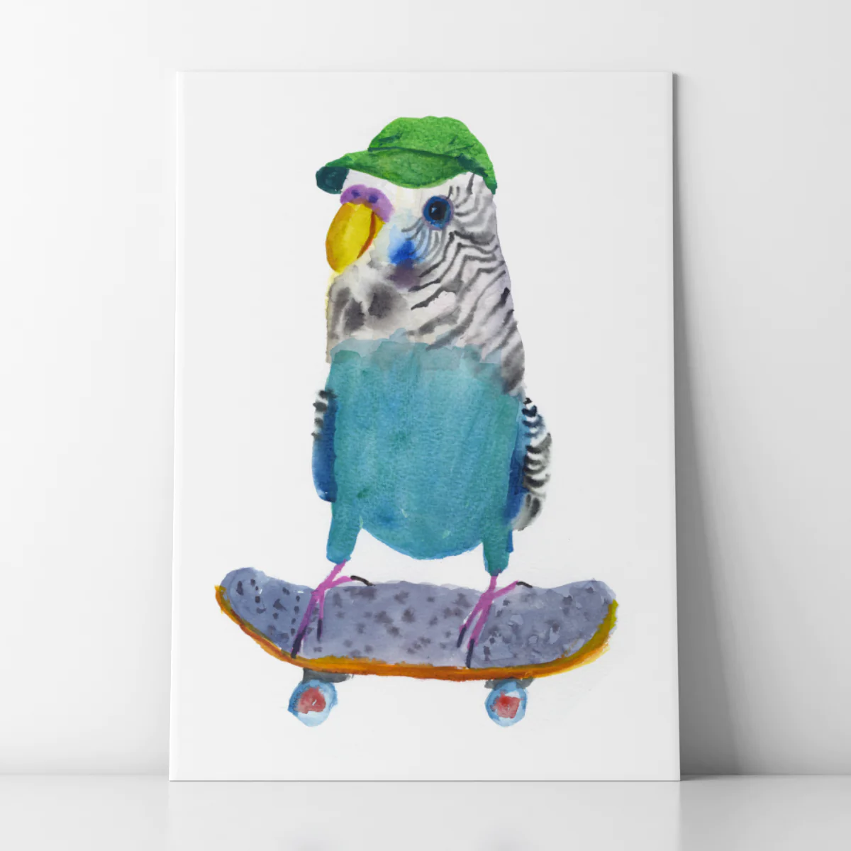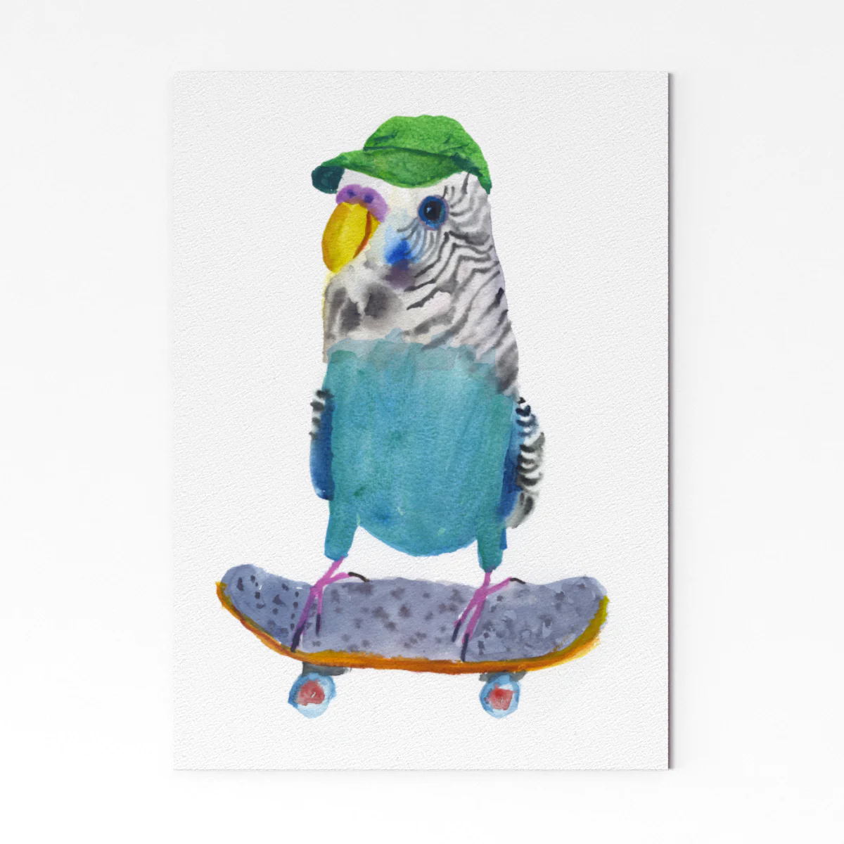 This lovely Skate Budgie A4 Art Print is by independent artist Rosie Webb. Rosie is a watercolour artist who creates her paintings in a loose and expressive way that incorporates a lightness of touch with humour. The result is lovely quirky and charming animal prints that are perfect for brightening up the home.