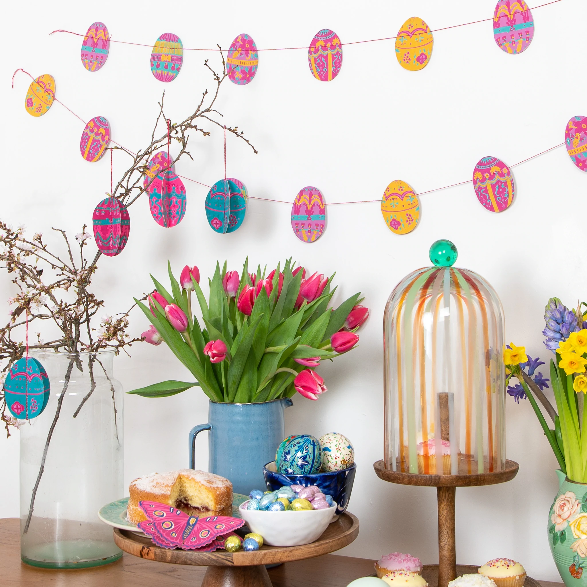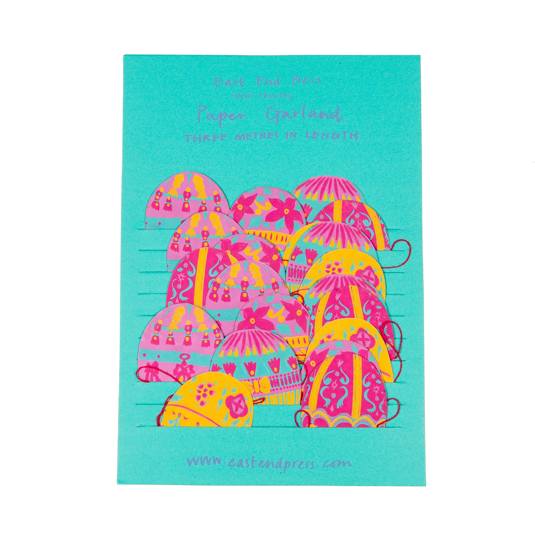 Hand printed three metre long paper garland, featuring twenty screen printed paper Easter eggs, each around 10cm in height. The garland is printed on both sides on thick, hand made cotton paper. The shapes are sewn in a random order along strong cotton thread, with hanging loops either end, meaning the garland can be hung straight away!