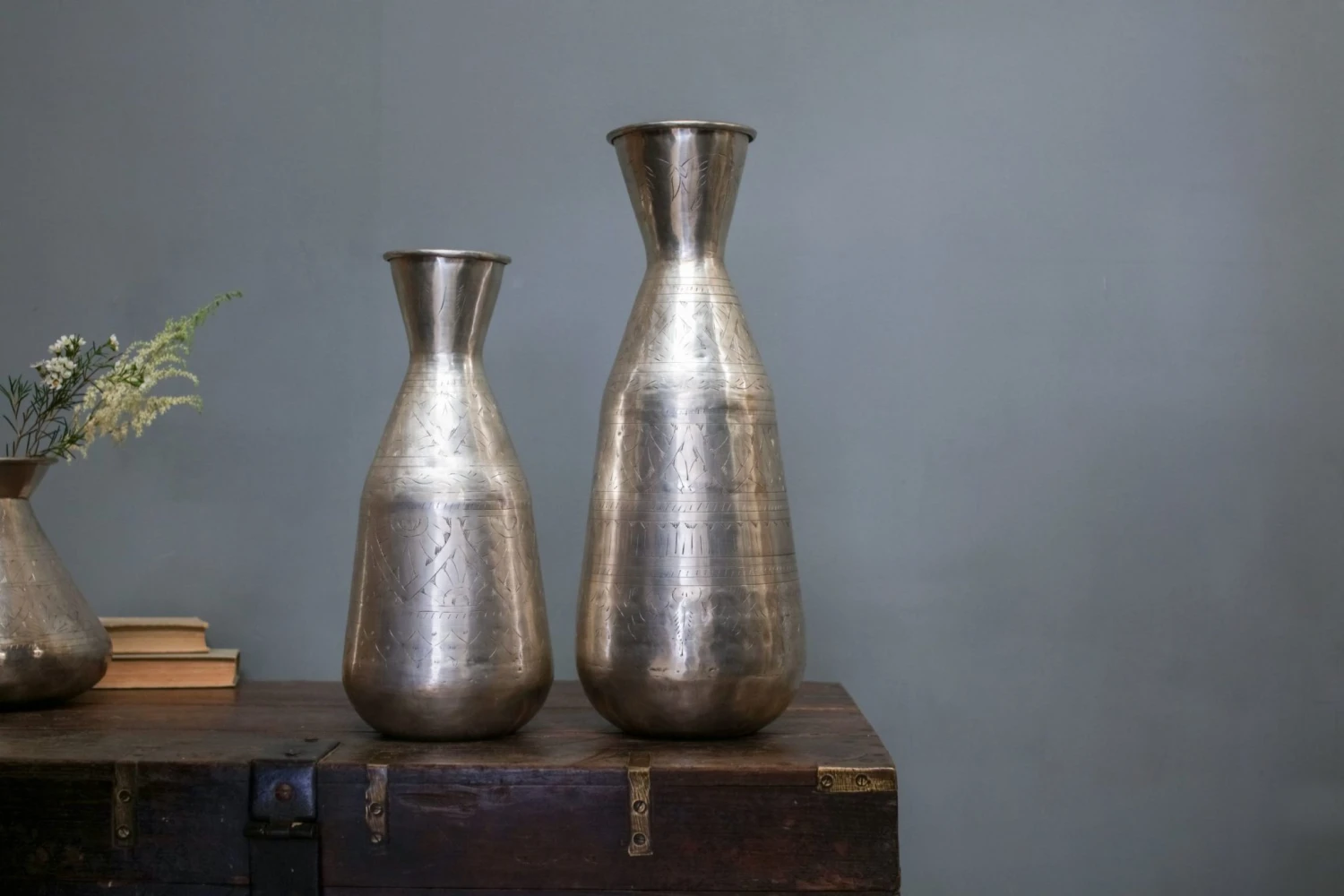 The Negana etched brass vase from Nkuku has been hand finished by talented artisans using age old techniques. They have an antique silver plated finish to the vases which gives them a lovely patina. The are perfect filled with cut flowers or foliage.