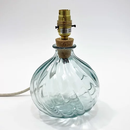 This simple yet stylish Spiral recycled glass lamp base from Jarapa makes a lovely addition to any living space. The spiral swirl of this lamp really catches the light. It is made from recycled glass from Spain and has a cork fitting in the top from Portugal. The cream flex and brass metal fittings are all made in the UK and the lamps are assembled in Jarapa’s Somerset workshop. The lamp base measures 23cm high and has a 2 metre cream flex.