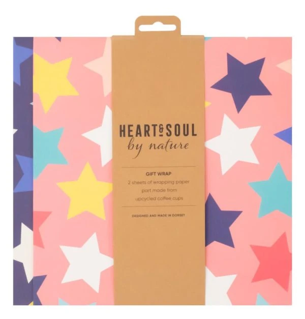 Two sheets of folded ‘stars’ wrapping paper. This gift wrap has been part made by recycled coffee cups.