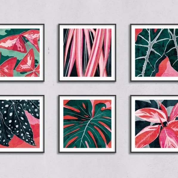 Inspired by some of Ruth favourite house plants. With beautiful foliage, extraordinary patterns and bold forms, Ruth has focussed on highlighting the details of the leaves to create a bright and colourful series perfect for plant lovers and colour addicts!