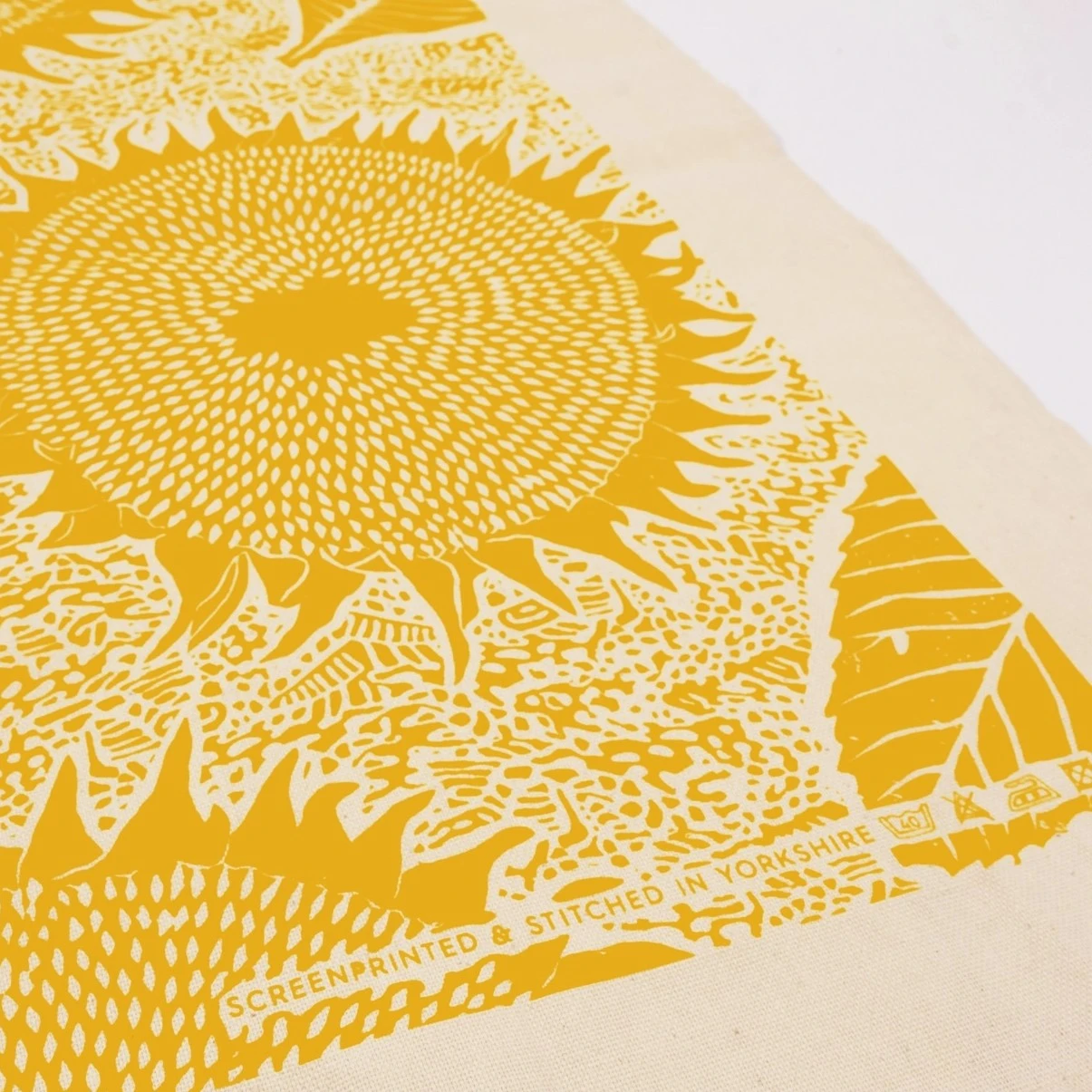 Sunflower tea towel design developed from a combination of Studio Wald’s original lino cut leaf and texture patterns. Screen-printed in Yorkshire on unbleached cotton. Handy hanging loop included and hemmed on all four sides.