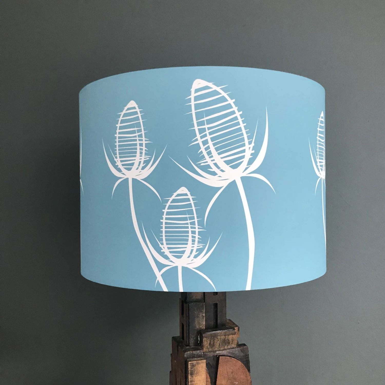 Teasel Blue lampshade, hand made by Alison Bick using fabric that has been printed with her teasel illustration.