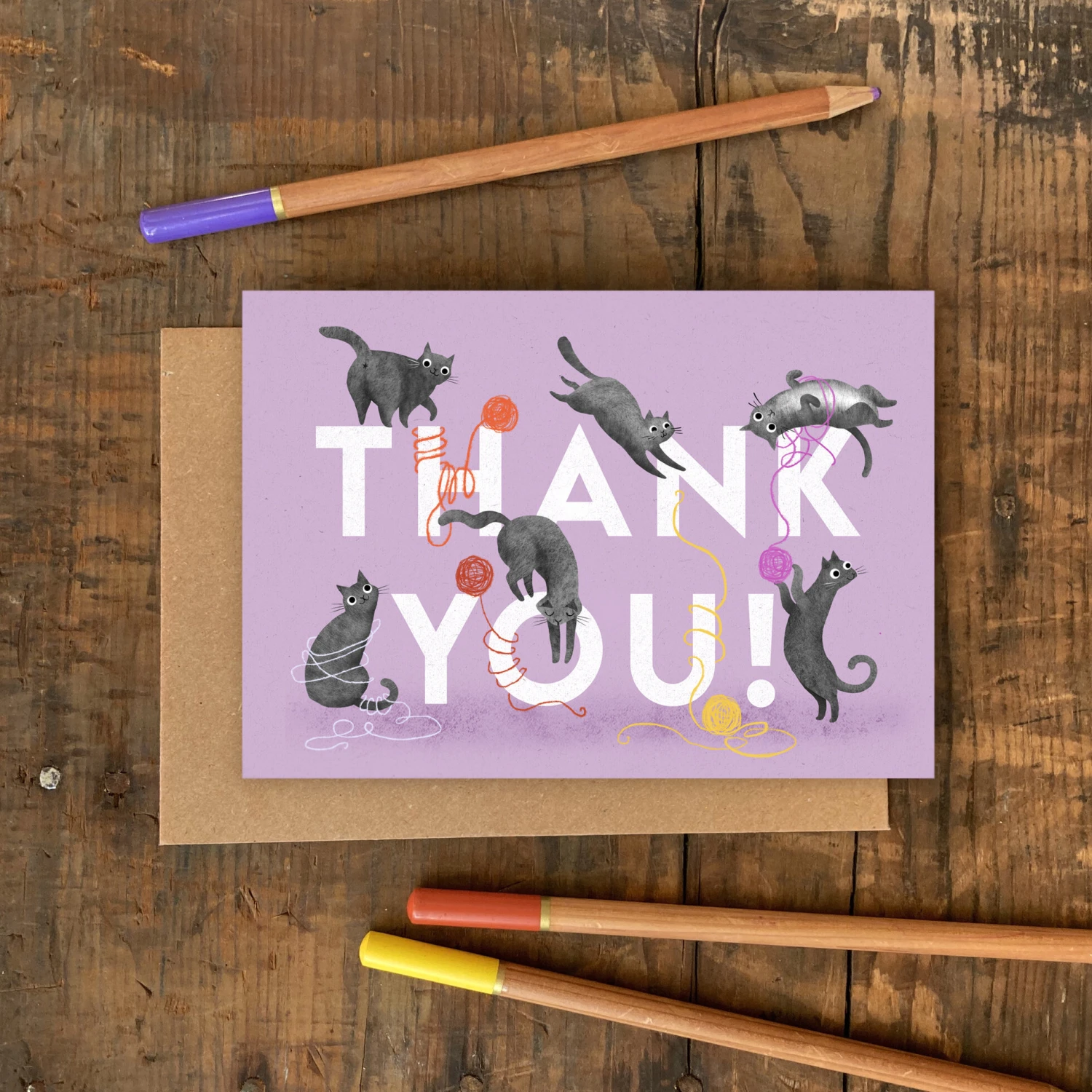 These beautiful Cat Thank you cards are all designed by artist Emily Nash in her Bristol studio and printed in the UK. All cards are A6 in size and all paper used is recycled or FSC approved paper stock. The envelopes are made from 100% recycled material and in a bid to cut down on single use plastic greeting cards come with card clasp stickers.