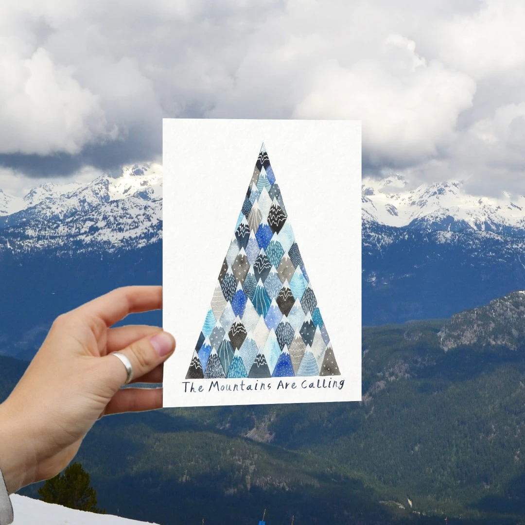 Small indigo mountains nestle together to form one big mountain. Accompanied by the text ‘The Mountains Are Calling’ to remind you of what’s waiting out there to explore!