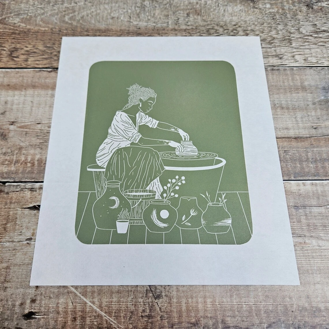 The Potter by artist Megan Hall of Flotsam Prints is an original limited edition Linocut print and depicts a potter hard at work. This is a limited edition of only 7 prints. Titled ‘The Potter’ each print comes numbered and signed in pencil.