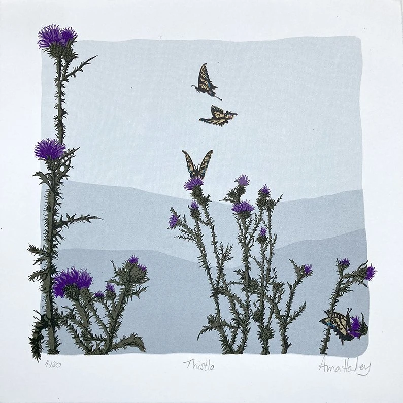 The Thistle screenprint is an eleven colour print on Somerset paper by Anna Harley. Anna uses a combination of drawing, digital photography and objects directly exposed on the screen to create the individual layers in her prints. She enjoys the tension these different sources create in her finished work. When making a new print, she tries to stay open minded about how the finished work will look, to allow the print to make itself. Print is an extremely process led way of making art and allowing the unexpected to happen and taking advantage of these happy accidents allows the work to stay fresh and exciting.