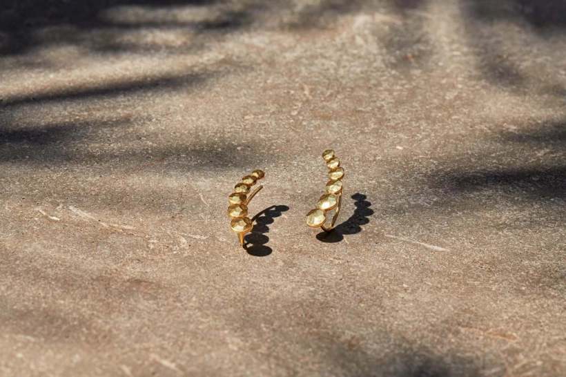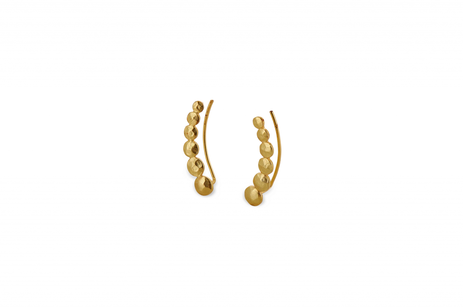 These Tripura ear climber earrings from Nkuku are handmade by artisans in India. They are made from 22ct gold plate. They are hypoallergenic and nickel free. The ear climbers have a flat textured beaded circular design that get gradually smaller as they climb the ear.