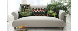 The cushion is edged with green blanket stitch and fastened at the back with mother of pearl buttons. Mix and match cushions from her tropical designs to create an interesting display.