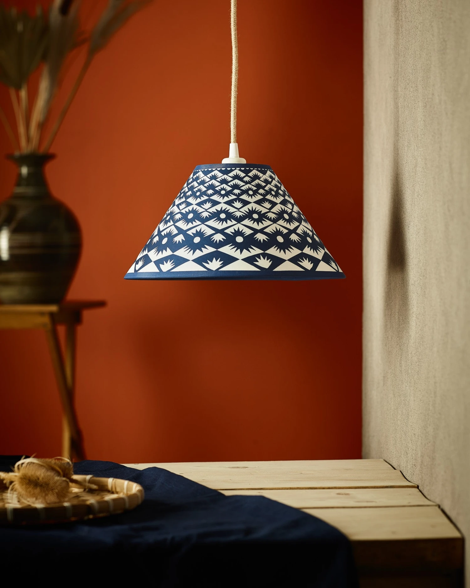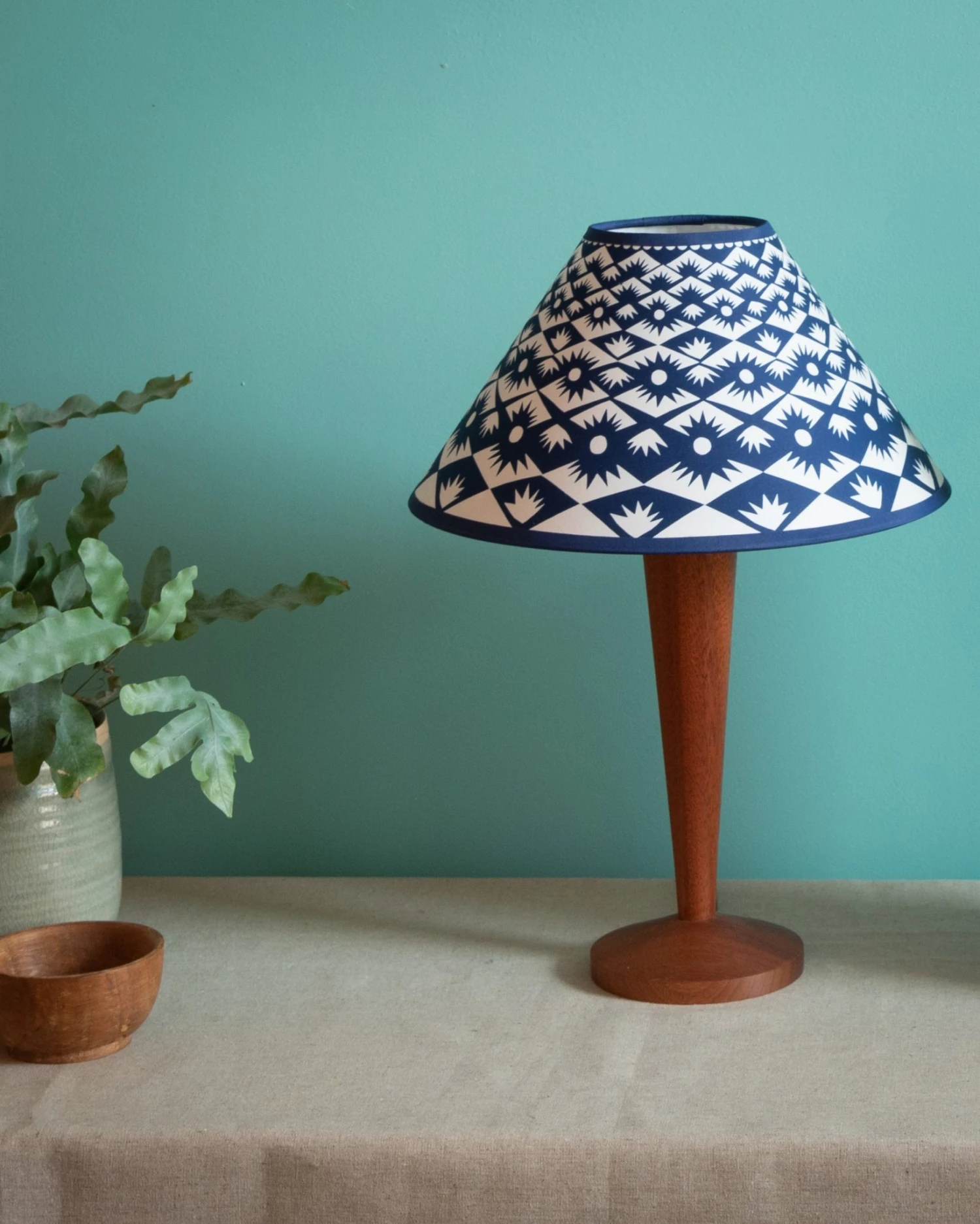 This beautiful 12″ Tuft blue lampshade has been hand printed onto paper under the sun using the 19th century photographic method of cyanotype producing a lovely Prussian blue. Also known as a ‘blue print’ or ‘sun print’. This lampshade features the classic blue and white Tuft print on a coolie lampshade style.
