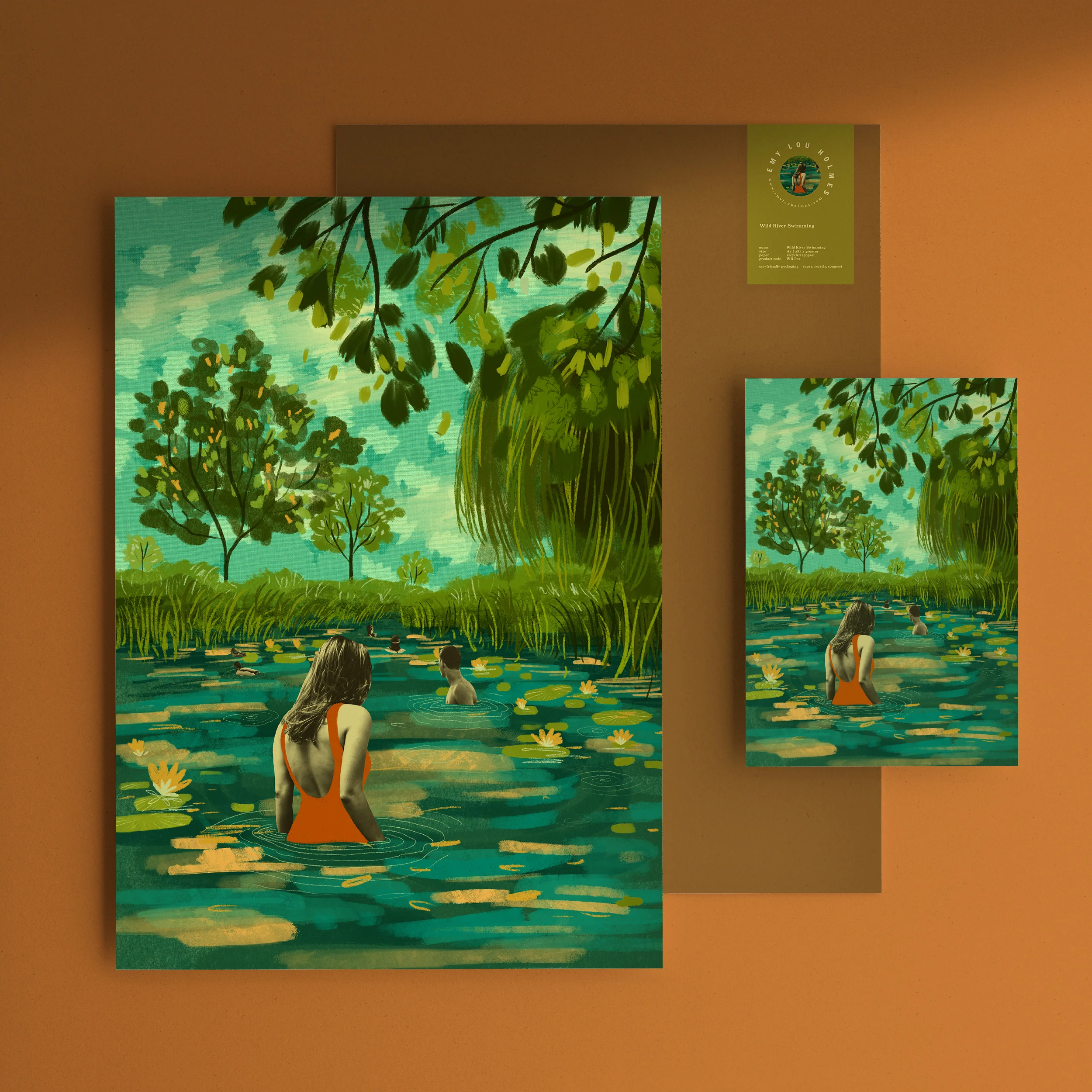 This artwork is a unique illustration created by Emy Lou Holmes. The Wild River Swimming was created digitally in Procreate on the IPad Pro and in Photoshop.