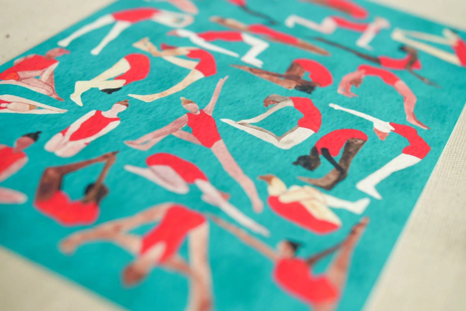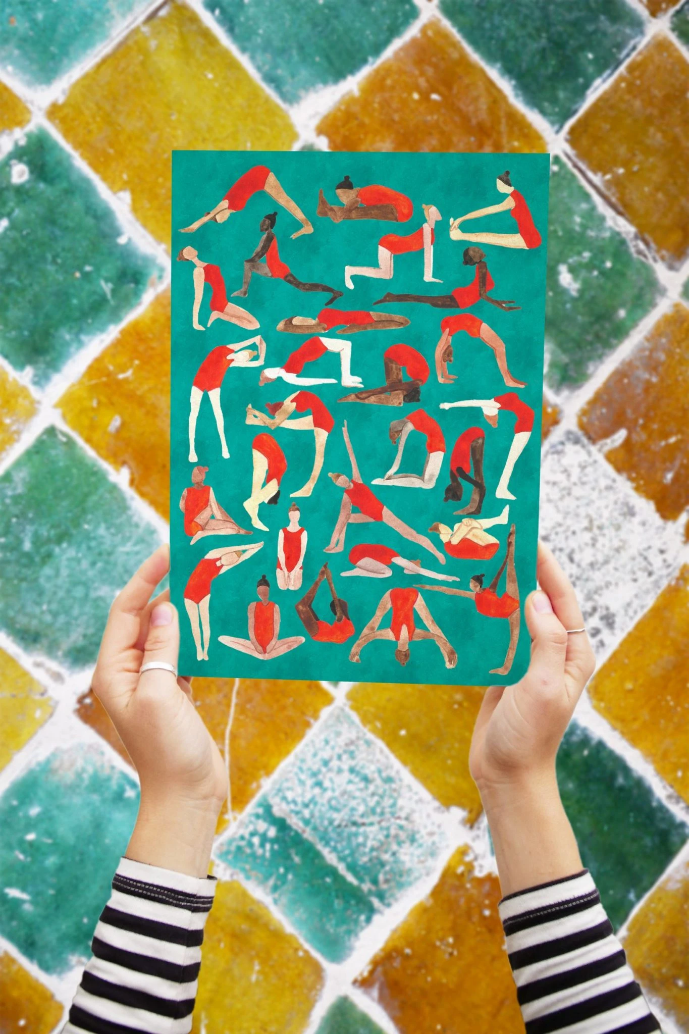 This is a wonderful limited edition giclee print by Hattie Buckwell. Hattie is an artist working in Bristol, England. She primarily works in watercolour and this is a print of her original watercolour paintings of different Yoga Poses. A lovely turquoise background with bright figures in different poses are sure to inspire. A beautiful print to bring colour into your home.