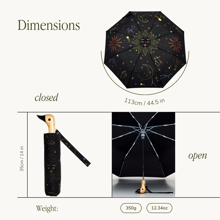 This lovely Zodiac Patterened umbrella from Original Duckhead is designed in London and handmade with care. These umbrellas are compact and eco-friendly as the fabric is made from 9 recycled plastic bottles.